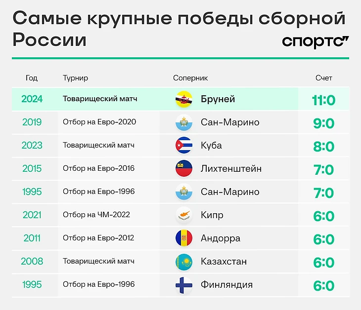 Бруней не впечатляет, но результат исторический – самый крупный разгром за всю историю сборной России. Было 9:0 с Сан-Марино в 2019-м – рекорд переписан.
