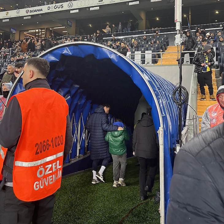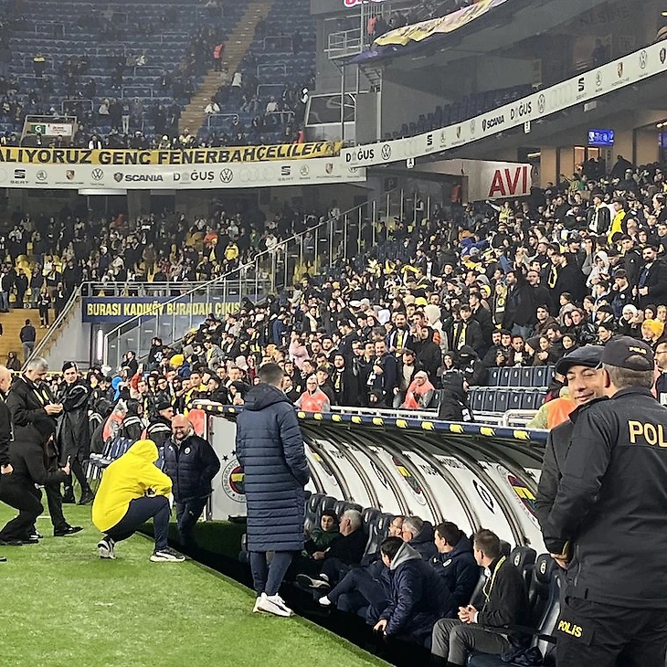 До свистка двадцать минут, и тренер показывает на кого-то с нижнего ряда центрального сектора. Мужчина с двумя огромными флагами «Фенербахче» спускается с широченной улыбкой, но Жозе показывает: нет, не ты.