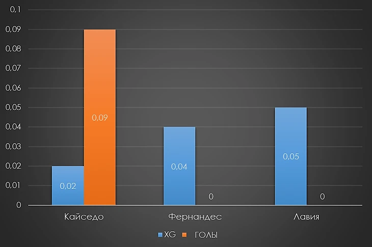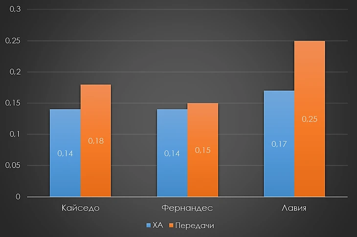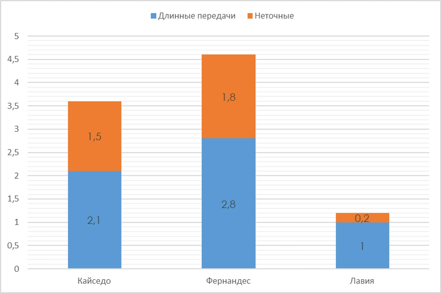 Он меньше касается мяча, чем в прошлом сезоне (80,9 касаний за 90 минут) и в своей последней кампании в «Брайтоне» (78,4). В 2024–2025 годах его средний показатель за игру составляет 70,0 касаний, и, как следствие, Кайседо делает меньше передач (55,2 за 90 минут, по сравнению с 65,7 в 2023–2024 годах).