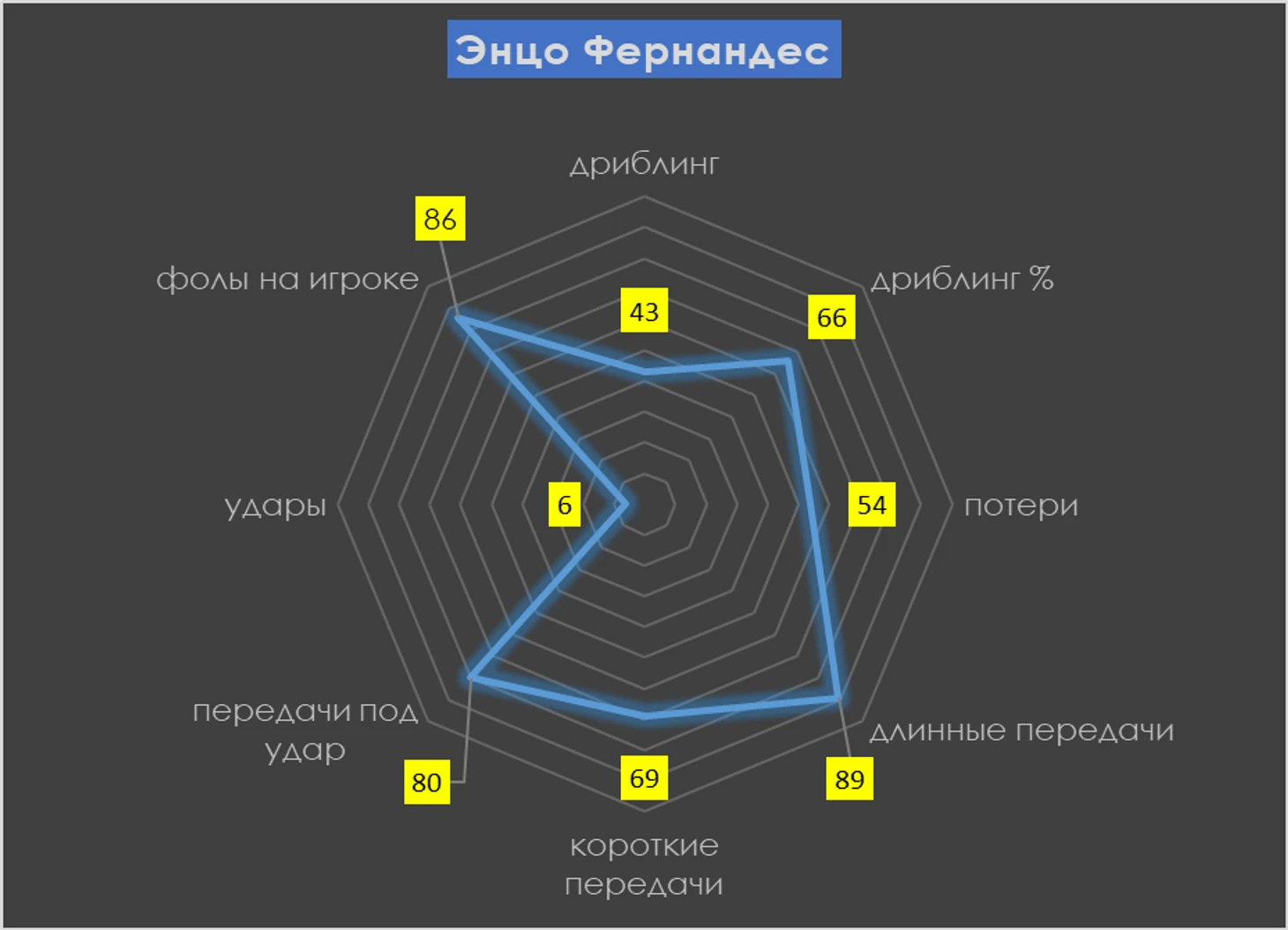 Рассмотрим показатели игроков в «Челси», рассматривать будем Энцо Фернандеса, последние 5 игр команда провела с таким сочетанием.