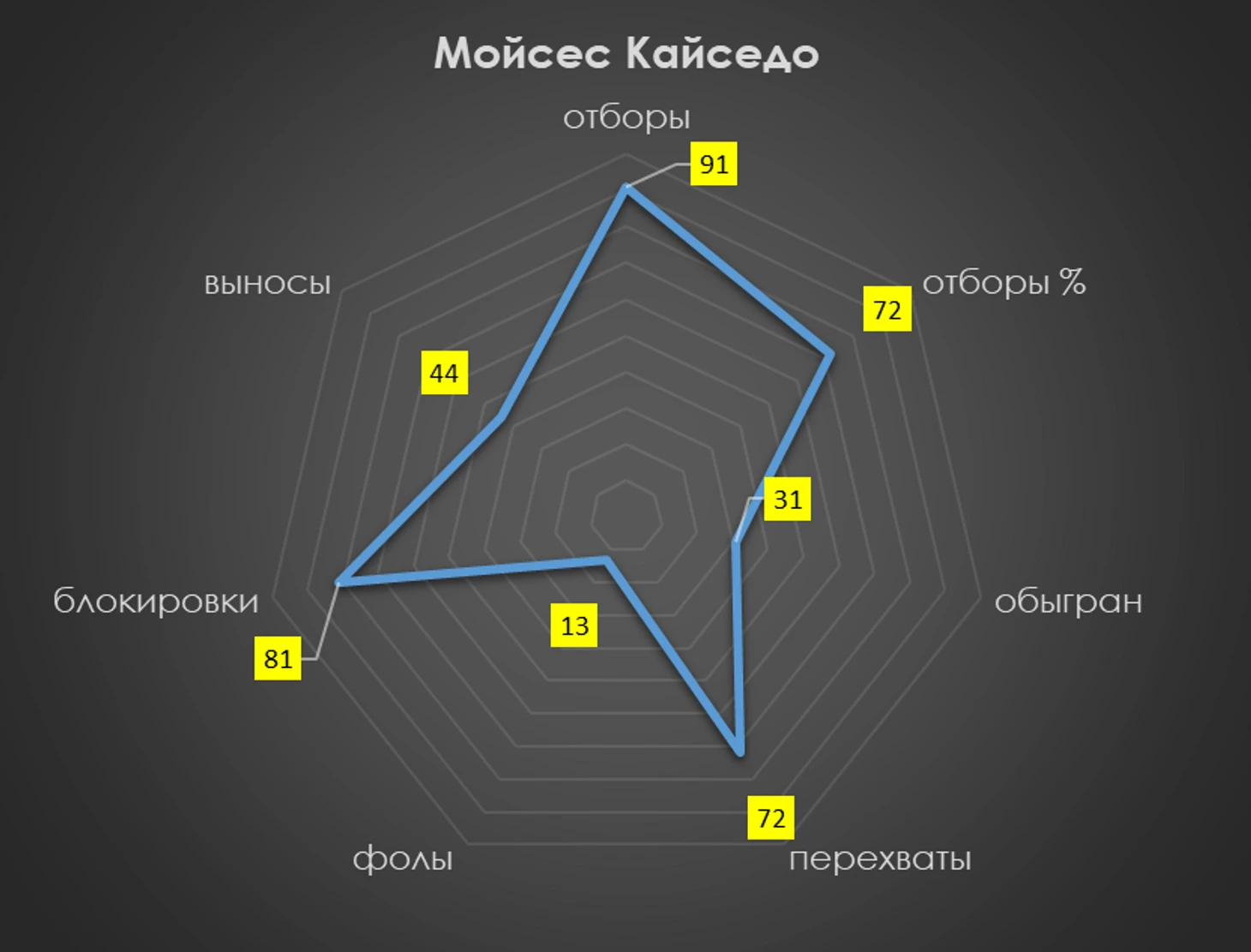 «Влияние [Кайседо] на команду выходит за рамки большинства статистических показателей, которые приводятся для полузащитников, потому что они не полностью отражают его роль и влияние на команду, — сказал бывший тренер «Брайтона», где играл Кайседо, Грэм Поттер в недавнем интервью BBC Sport. — Вы можете использовать эти бинарные показатели, такие как количество перехватов, пробежек или спринтов, и они говорят вам об одном, но не обо всём».