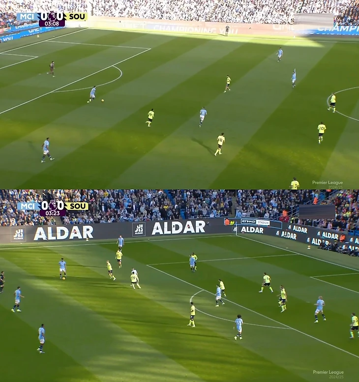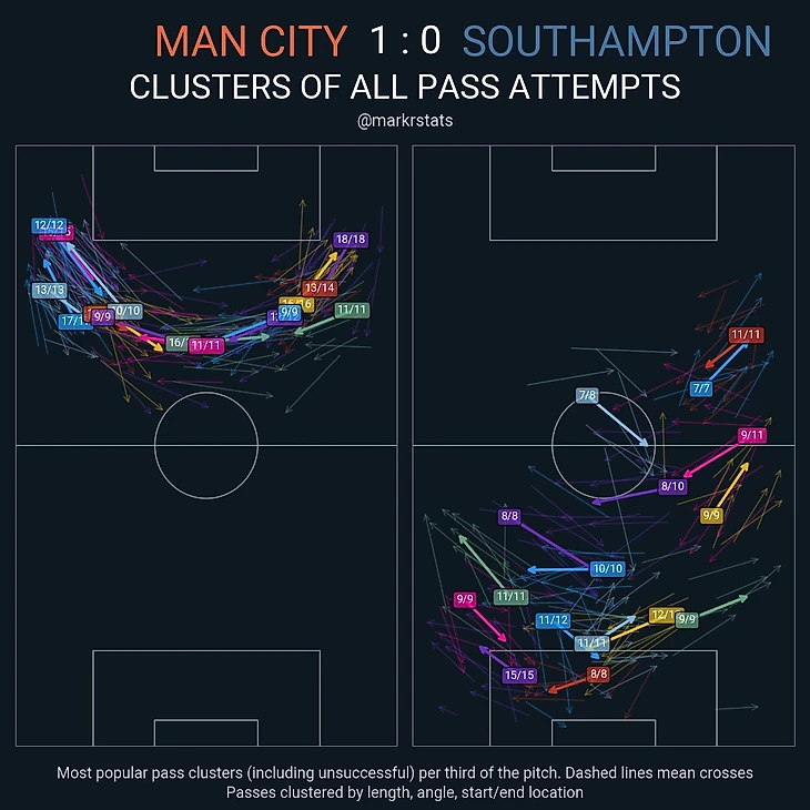 Владение мячом: количество против качества «Саутгемптон» входит в топ4 команд лиги по владению мячом (56,94%), уступая только «Манчестер Сити», «Тоттенхэму» и «Ливерпулю». Но эта статистика владения никак не отражается на результативности: команда забила лишь 7 голов, а разница xG составляет -5,1. Проблема в том, что владение мячом преимущественно происходит на своей половине поля. Саутгемптон занимает первое место в лиге по количеству касаний в своей трети, и 11-е по касаниям в финальной трети. Для сравнения у «Сити» 20-е и 1-е место соответсвенно, что полная противоположенность «святым».