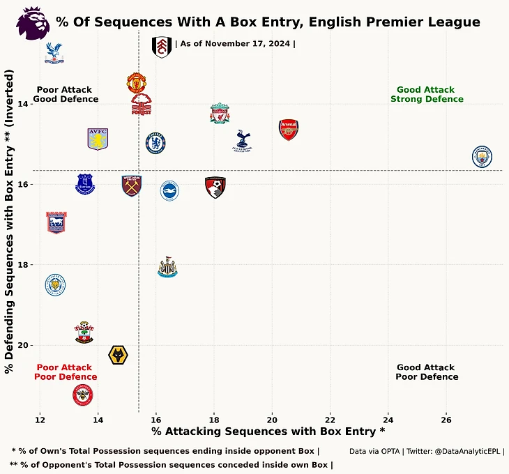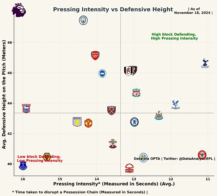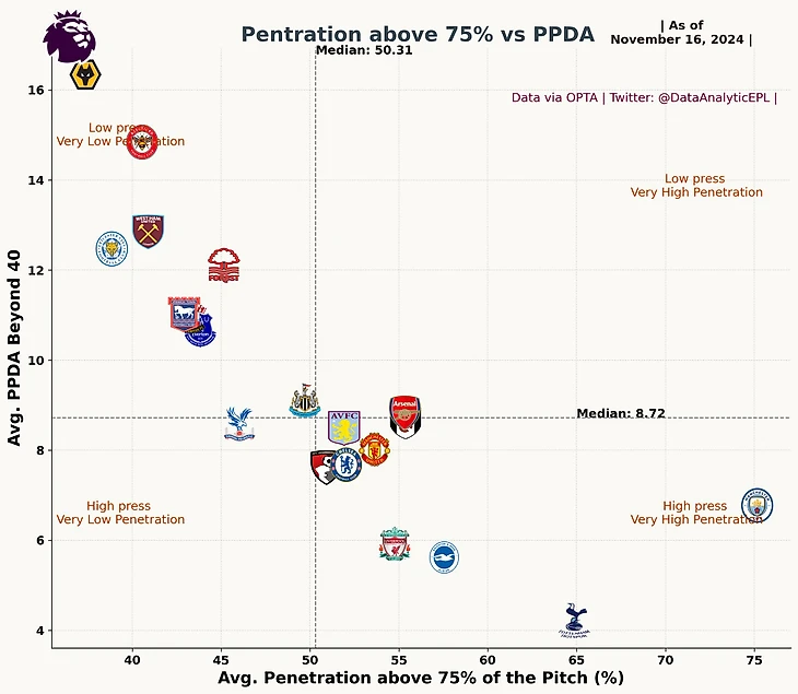 «Саутгемптон» явно не выглядит командой, которая эффективно использует прессинг. По моему мнению, это один из ключевых аспектов, над которым Мартину предстоит серьёзно поработать. Показатель PPDA (количество передач соперника на одно оборонительное действие) у команды находится на уровне «Ипсвича» и «Эвертона». Насколько далеко находится «Сити» видно на графике.
