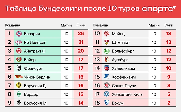 Теперь – Бундеслига после 10 туров. В формате «одно предложение на команду» мы подчеркнули самое важное/яркое/определяющее сезон. А кое-где – ироничное и забавное.