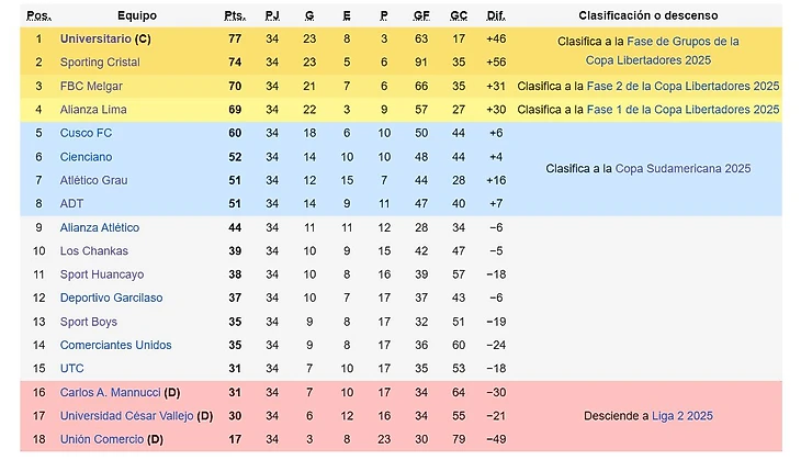 Завершился чемпионат Перу 2024 года. «Университарио» досрочно стал чемпионом, как победитель Апертуры и Клаусуры (последний раз такое удавалось «Альянсе» в 2017 году). В другой части таблицы, «Универсидад Сесар Вальехо» провалился и вылетел в Лигу 2. Кто еще потерял место в высшем дивизионе? Кто будет представлять Перу в Кубках Либертадорес и Судамерикана? Кто был лучшим игроком перуанской Лиги 1?
