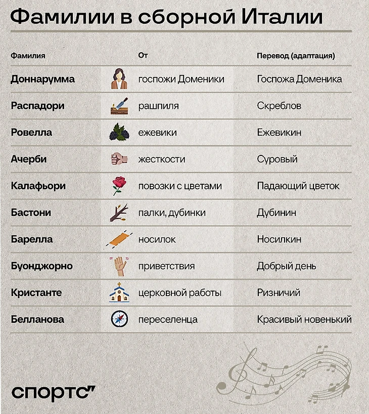 Похожий принцип в фамилии Каннаваро – его предки выращивали канну. Верратти («Вепрев») происходит из Марке, лесистого региона в центральной Италии; в Средние века там процветала охота на кабана. Кьезу уже 30 лет рисуют в младших классах, когда учительница просит изобразить Церковь – очевидно, по службе родоначальника. Викарио и представлять не нужно.