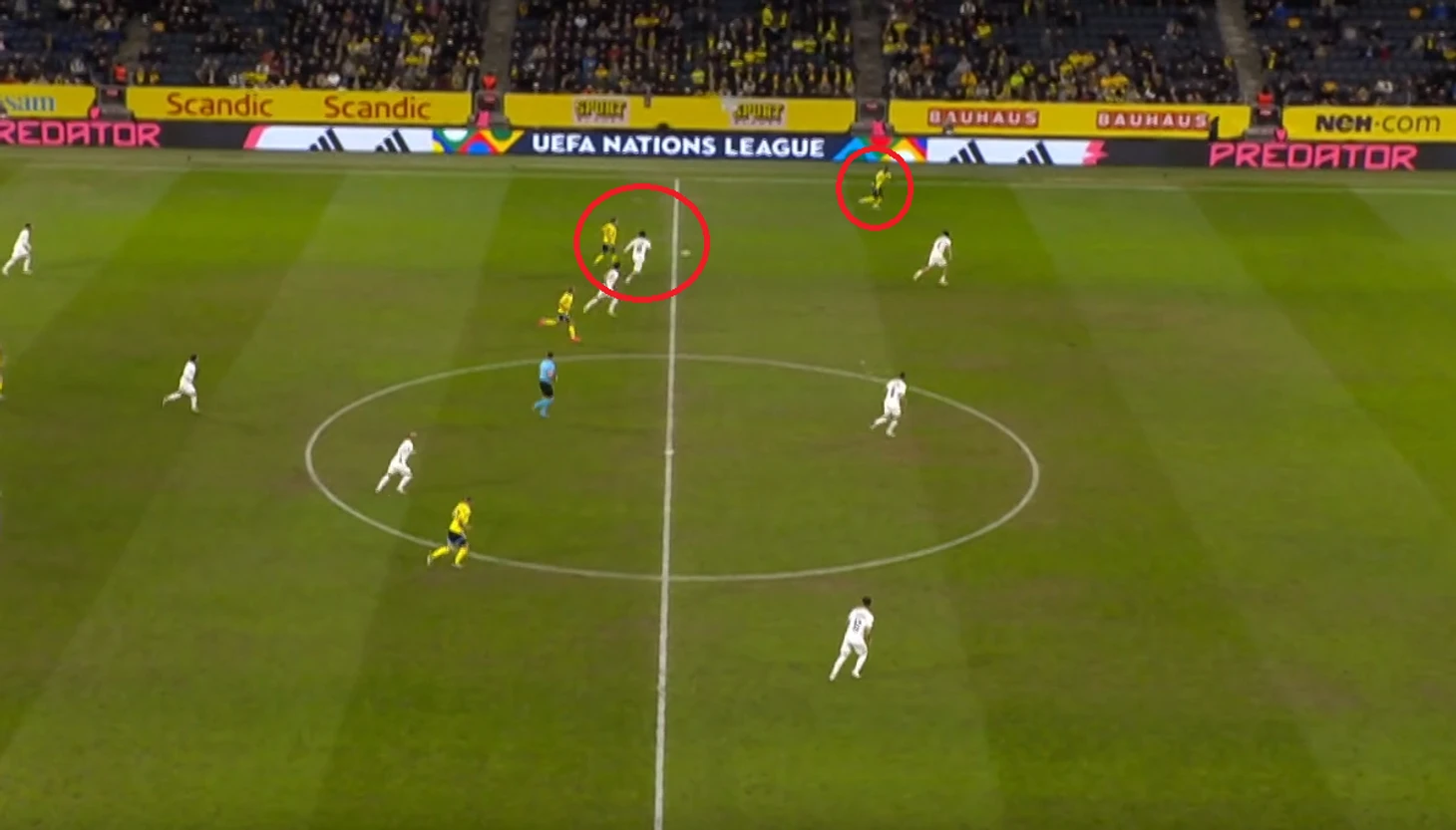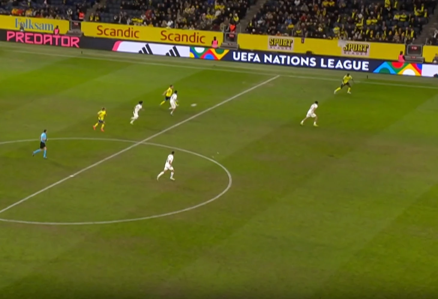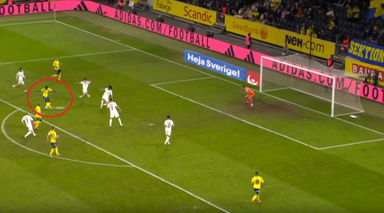 Атака в конце первого тайма, пас Виктора Дьокереша Исаку. Затем форвард убежал и забил. Офсайда и близко быть не может – даже через мгновение после паса Исак на несколько шагов позади защитника.