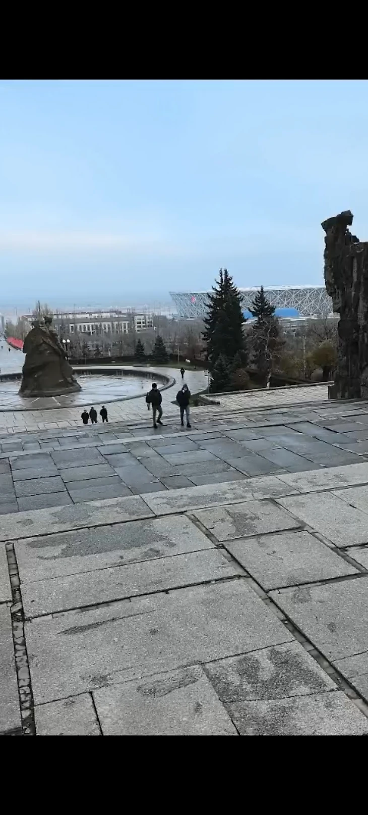 В общем мы пошли на Мамаев курган. Монумент и сам весь комплекс конечно впечатляет. Величественные памятники «Родина-мать зовет» и «Стоявшие насмерть», стены руины, музыка того времени и голос Левитана, все тебе дает понять что ты в знаковом месте и вести себя нужно соответствующее. Мы дошли до площади «Стоявшие насмерть» и дальше не решились идти, так как уже устали да и в Волгограде очень холодно, причем по-особенному по волгоградски, но об этом позже. Хочу еще отметить наличие полиции на каждом уровне Мамаева кургана, чувствуешь ты себя в абсолютно безопасности, а так же к ним можно подойти спросить что где и как, все очень вежливо отвечают. Как и все туристы мы конечно купили сувениры, магнитики себе и всем родственникам, фонарики с символикой Сталиград, зажилкой, ну и не смог я пройти мимо фляжки с портретом Иосифа Виссарионовича Сталина, влюбился с первого взгляда. Для тех кто поедет не маловажным будет знать что чем выше уровень кургана, тем дешевле сувениры. Мы купили их на нижней уровне, понимаемся и «О, Сюрприз», на уровне выше они уже дешевле. Предполагаю что туда куда мы не дошли цены тоже пониже.