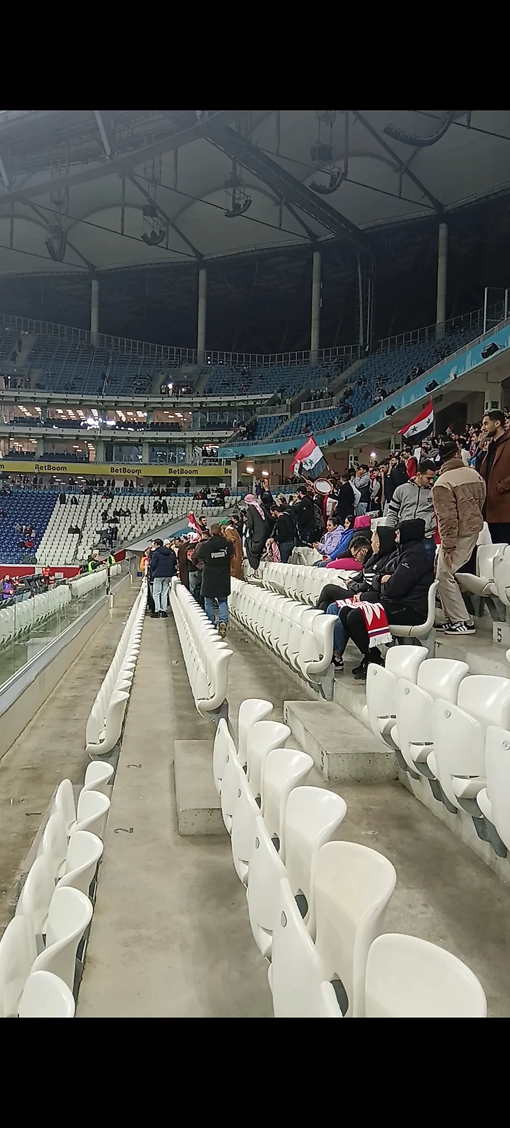 На трибунах было спокойно, люди еще собирались, антураж придавали болельщика сборной Сирии которые заняли половину нижней трибуны, с флагами и кричалками они неплохо поддерживали свою команду. Кстати, выйдя в перерыв в подтрибунное помещение увидел сирийцев которые прыгали и кричали какие-то кричалки, снял это и пошел дальше, а потом обнаружил на спортсе новость, что это было своего рода политический манифест (болельщики кричали F...k одна большая и многоуважаемая страна) который, кстати, особо никто не останавливал.