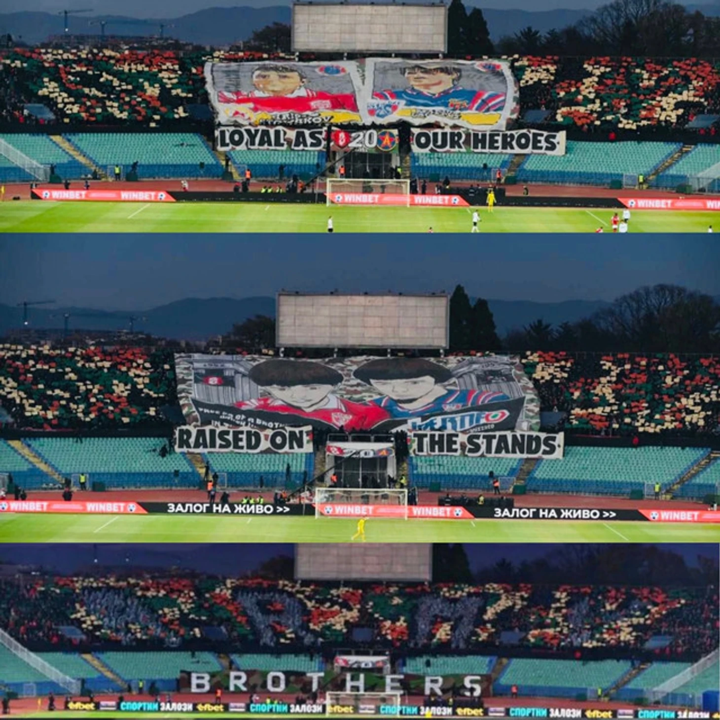 На своих баннерах, помимо двух молодых фанатов ЦСКА и «Стяуа», читающих фанзины, болгарские ультрас изобразили в виде наклеек «Панини» легенд обоих команд — Христо Стоичкова и Мариуса Лэкэтуша. Блестящая карьера Стоичкова и так всем известна, разве что кроме одного крайне любопытного факта: в 1985 году Стоичков стал зачинщиком массовой драки с футболистами «Левски» во время финала Кубка Болгарии (игра была крайне грубая, соперники заработали на двоих 3 удаления еще за 15 минут до финального свистка), из-за чего получил пожизненную дисквалификацию и был отправлен служить в армию. Спустя полгода решение о дисквалификации было отменено, но карьеру игрока он продолжил лишь в 1986 году.