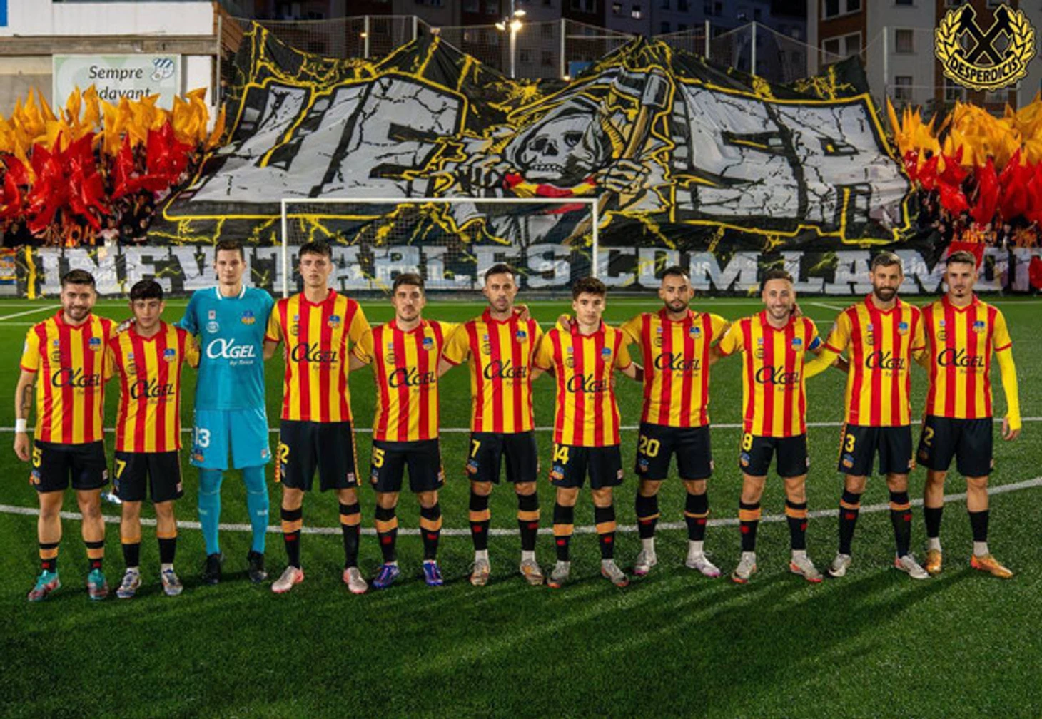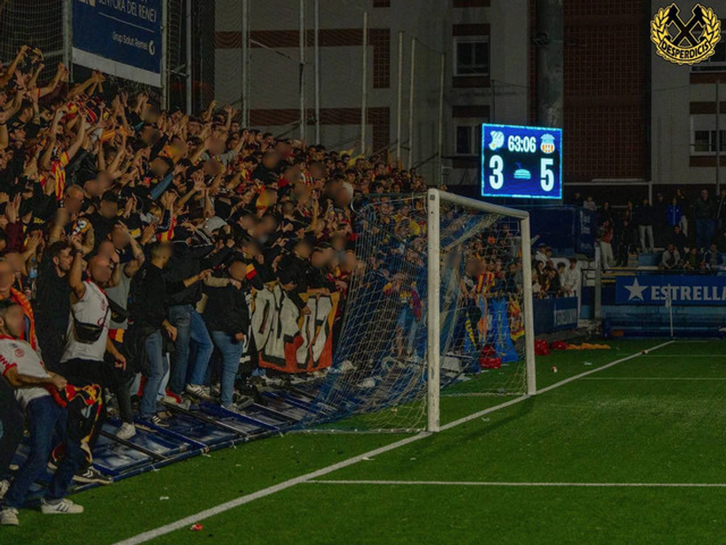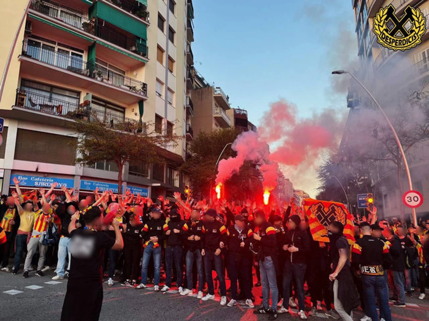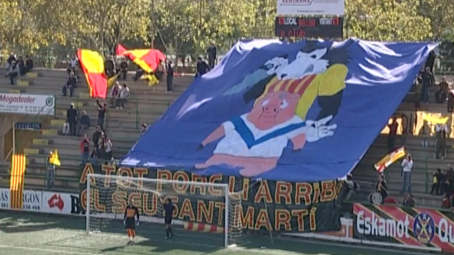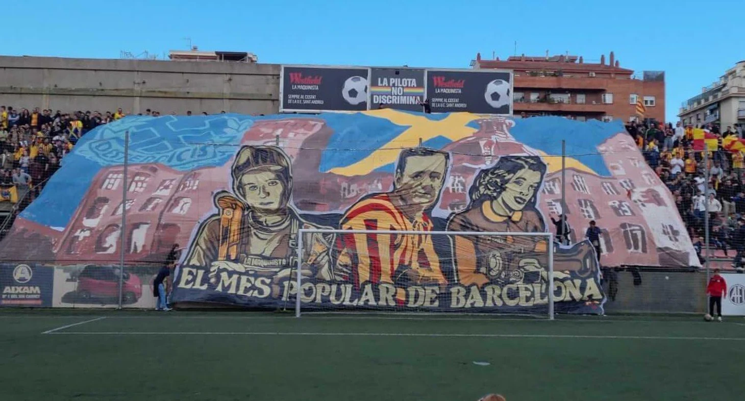 Группировка же «Desperdicis» ответила своим творчеством с изображением аббревиатуры клуба «Unio Esportiva Sant Andreu», смертью с косой в красно-желтом шарфе и подписью «Неизбежно, как любовь». По краям баннера были подняты желтые и красные флажки.