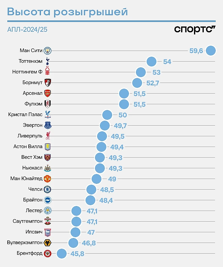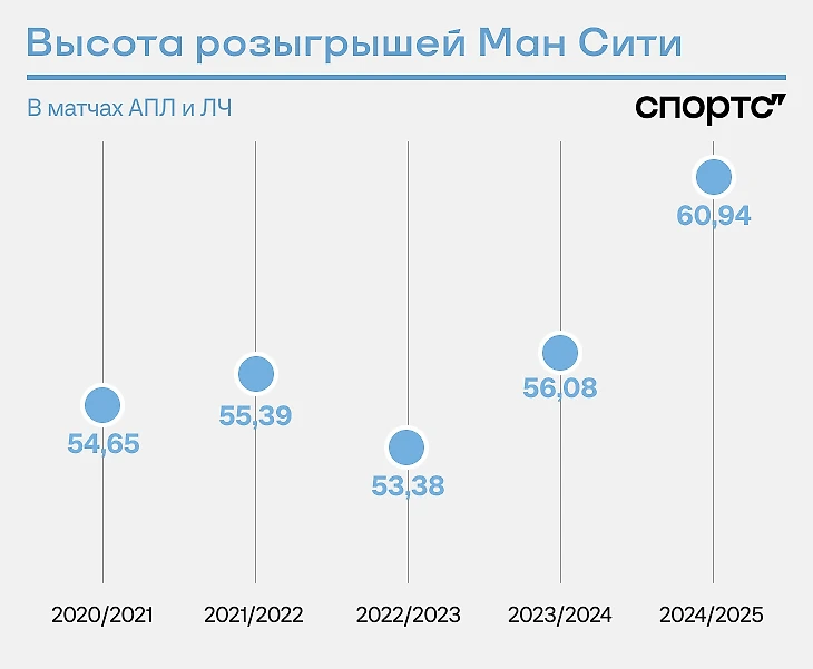 Более того, статистика выглядит перебором, даже если сравнивать нынешний «Сити» с другими «Сити». В матчах ЛЧ и АПЛ этого сезона средняя высота паса команды Пепа – почти 61 метр, на 5 метров выше, чем предыдущий максимальный показатель (есть данные только с 2020-го).