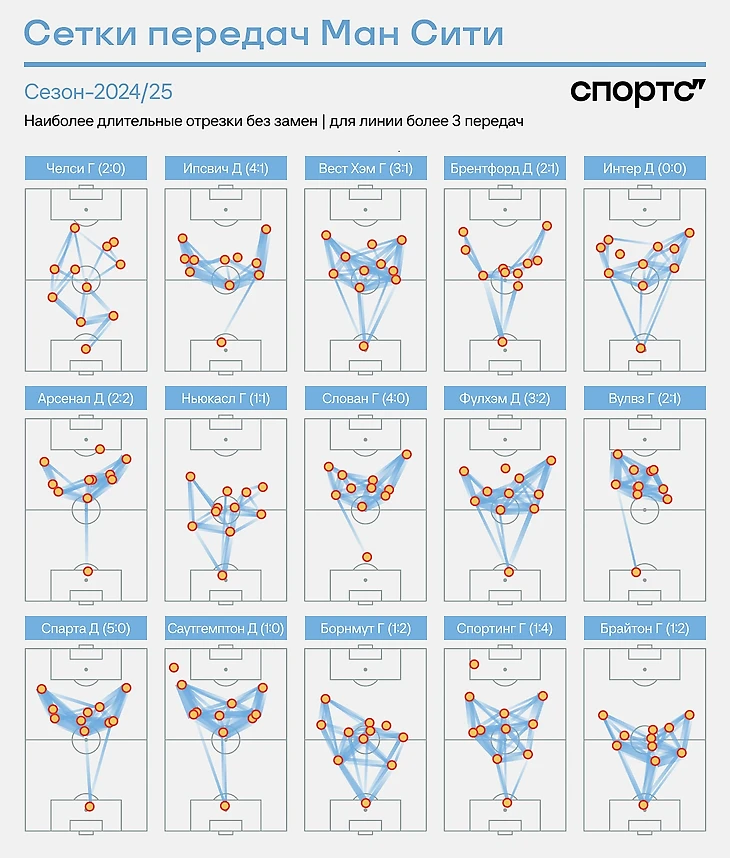 Посмотрите на сетки передач «Ман Сити» в этом сезоне – в шести случаях вся команда умещается на чужой половине. Это значит, что даже защитники большую часть матча проводили за центральной линией. Одна игра – ок, два – тоже, но шесть из пятнадцати в турнирах вроде АПЛ и ЛЧ – не перебор ли? Даже с учетом того, что «Арсенал» забыл про мяч после удаления Троссарда.