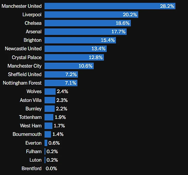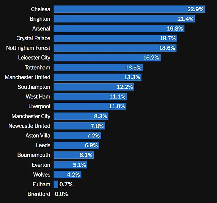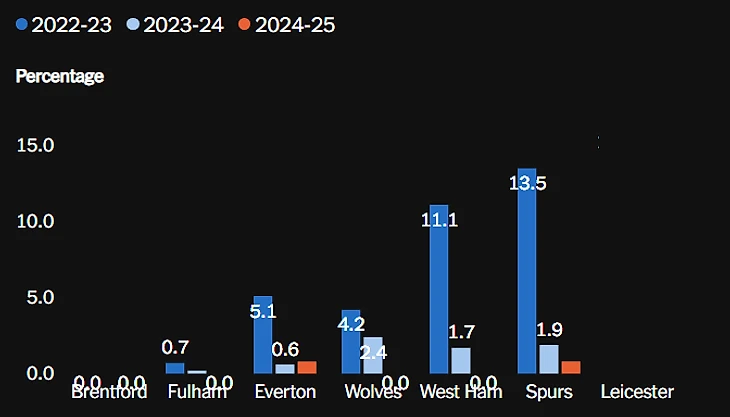 Харри Кейн, который покинул «Тоттенхэм Хотспур», чтобы присоединиться к «Баварии» в 2023 году, стал самым громким уходом из команды за последние сезоны, но Шпоры также продали игроков первой команды Оливера Скиппа и Джафета Тангангу. В результате процент минут, сыгранных местными игроками, упал с 13,5% в 2022/23 годах до всего лишь 0,8% в этом сезоне.