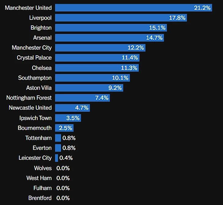 Как и «Ливерпуль», который в 2019 году подписал Брэдли из североирландского клуба «Данганнон Свифтс», «Брайтон», входящий в тройку лидеров по количеству минут, сыгранных в этом сезоне игроками, воспитанными клубом, умеет покупать молодых талантов на самых малоизвестных рынках. Эван Фергюсон, игрок сборной Республики Ирландия, присоединился к академии после подписания контракта с ирландским клубом «Богемианс» и, таким образом, входит в это число, но Хулио Энсисо, Саймон Адингра или Мойзес Кайседо (который ушел в «Челси» в 2023 году за рекордные для Великобритании £115 млн.) не входят, поскольку не провели достаточно времени в «Брайтоне» между своими 15 и 21 днями рождения.