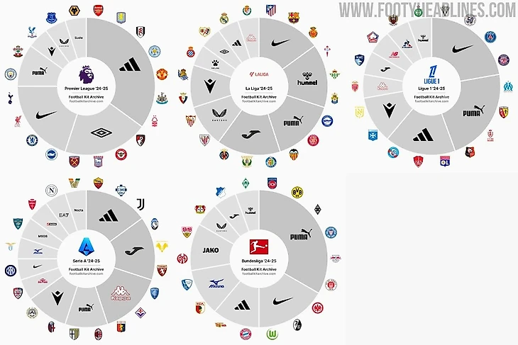 В топ-5 европейских лигах Puma лидирует по количеству команд, которым поставляет продукцию – их аж 17, за ней следуют Adidas и Nike с 16 командами каждая.