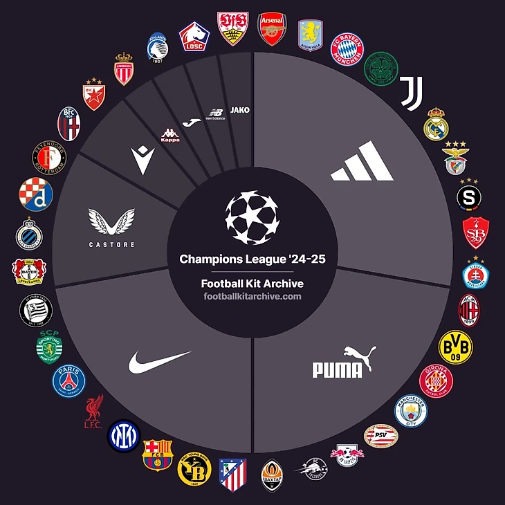 Лучший способ узнать, какой бренд находится на вершине — это взглянуть на текущих поставщиков Лиги чемпионов. Adidas лидирует с десятью командами, за ним следуют Puma и Nike с восемью командами каждая.