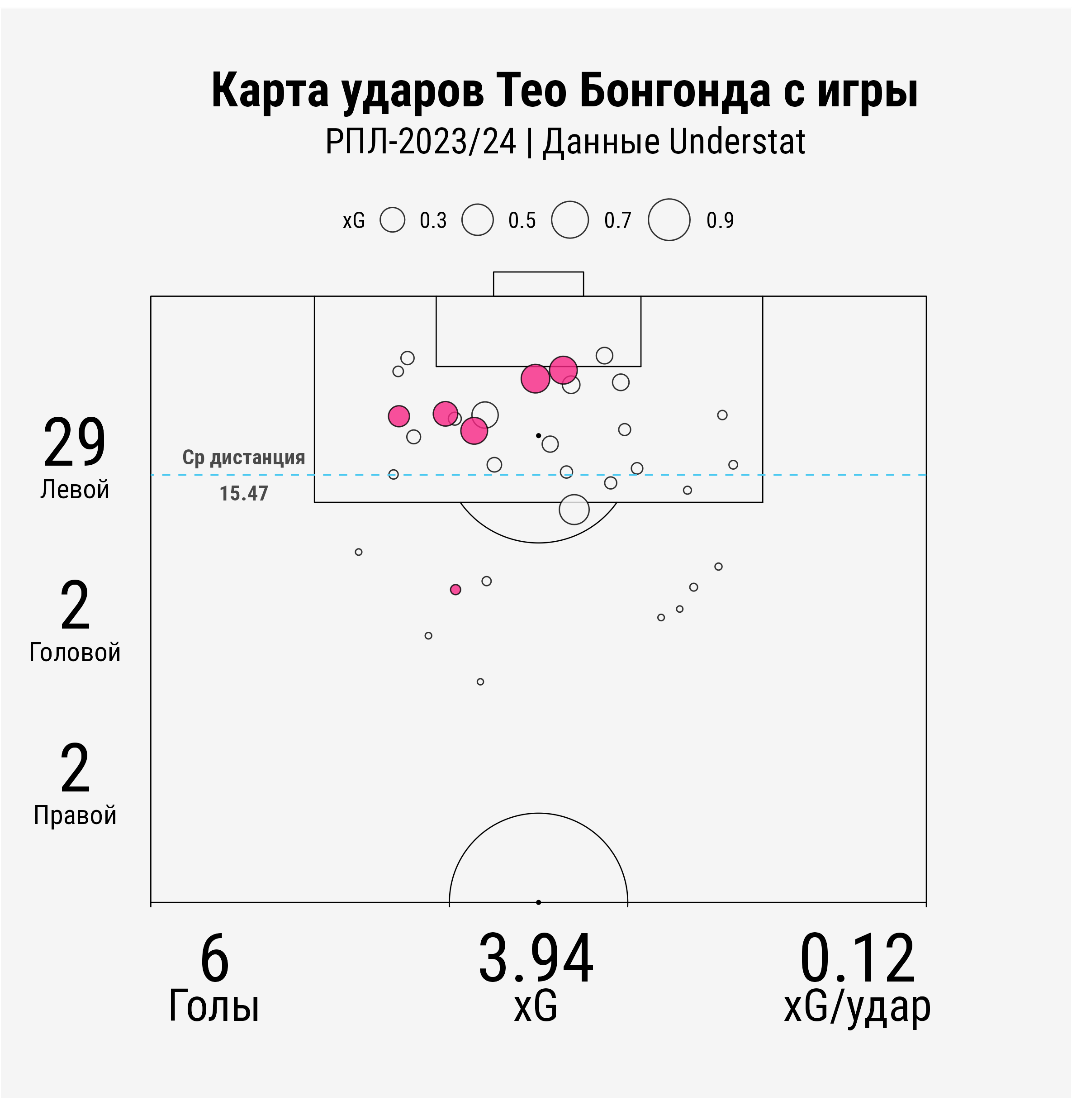 О бомбардирских подвигах Тео мы могли бы начать говорить еще в начале сезона. К 6-му туру вингер подходил с худшей разницей в лиге между забитыми и ожидаемыми голами (-2,2). Если бы не проблемы с реализацией и везением, у конголезца запросто могло быть на 2-3 гола больше (для сравнения: в последних трех турах забил четыре при 1,46 xG).
