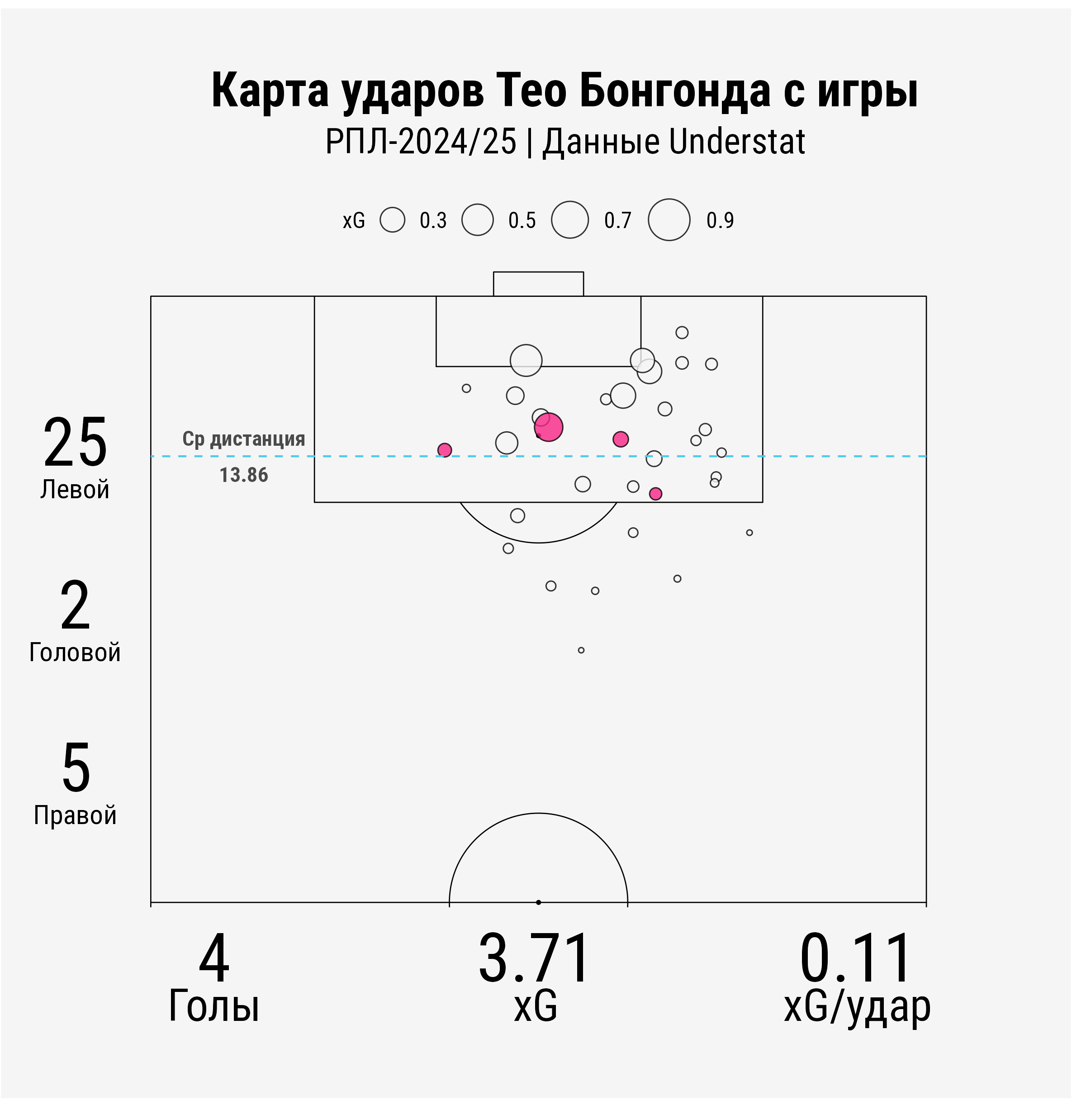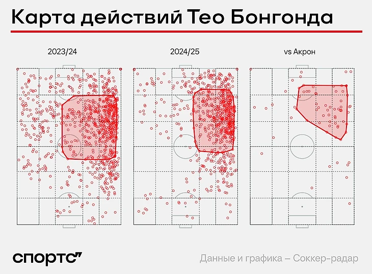 Короткая фантазия: было бы интересно посмотреть на Бонгонда, не привязанного к ширине, а обостряющего в полуфланге и между линиями. Тео запросто мог бы подыгрывать партнерам благодаря технике, включаться в штрафную вторым темпом под подачи, открываться за спину и бить из более выгодных позиций. Опыт игры на этой позиции у Бонгонда есть: в похожей манере разрывал с «Акроном», на последнем Кубке Африки любопытно играл десяткой за сборную.
