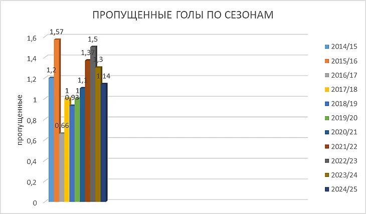 Ниже Вашему вниманию диаграмма пропущенных по сезонам (данные Championat.ru):