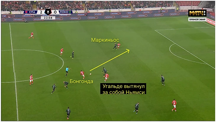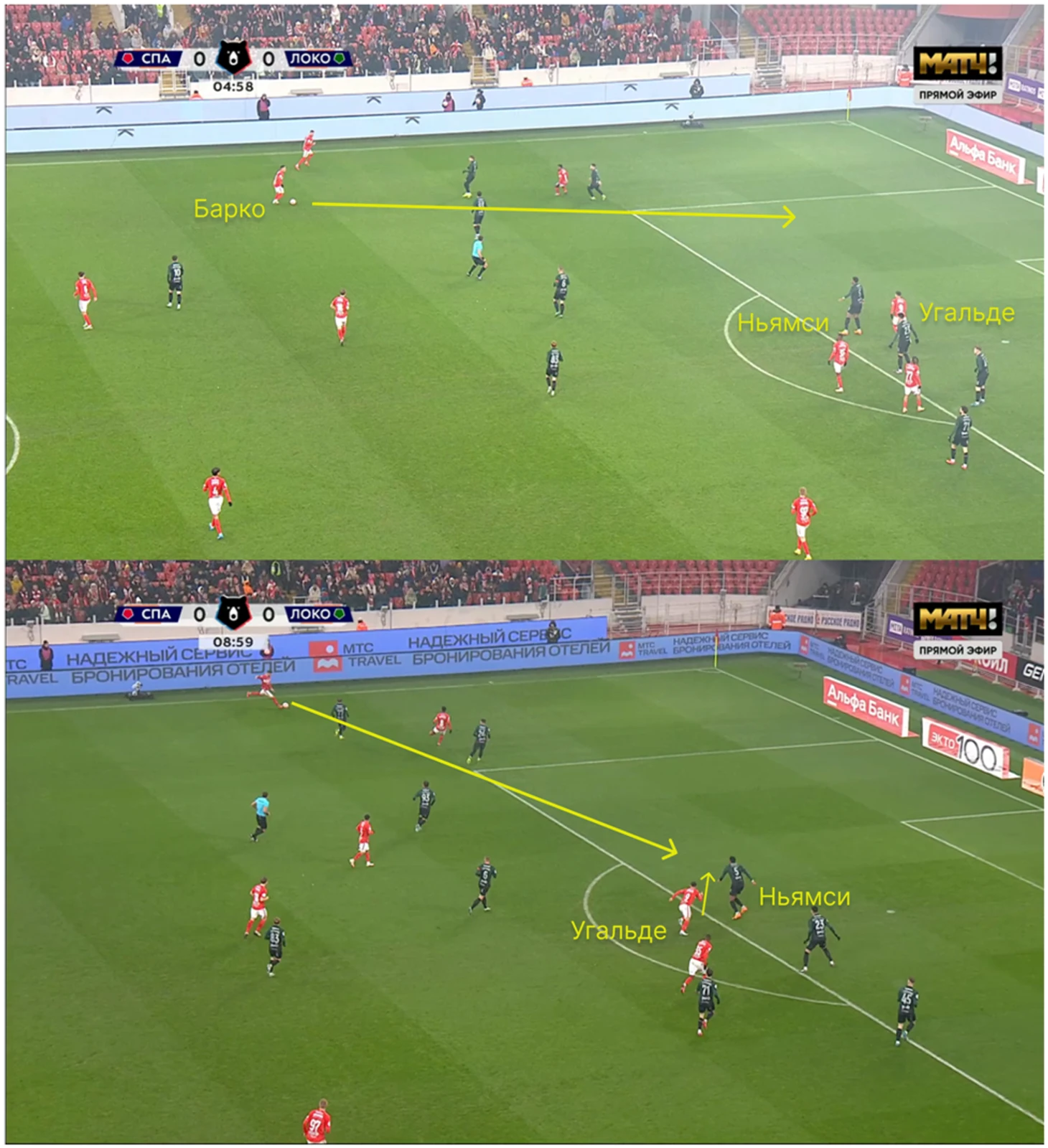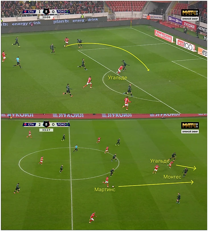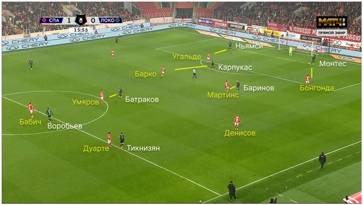 В этот раз Станкович провел работу над ошибками. Как выглядел прессинг «Спартака»: Тео Бонгонда поднимался в пару к Угальде (вместе давили на пару Ньямси – Монтес), Даниил Денисов выдвигался по флангу к Александру Сильянову, а Алексис Дуарте уходил направо к Наиру Тикнизяну. В центре поля работал принцип 1-в-1: Барко и Мартинс играли по Карпукасу и Баринову, Наиль Умяров стерег Батракова.