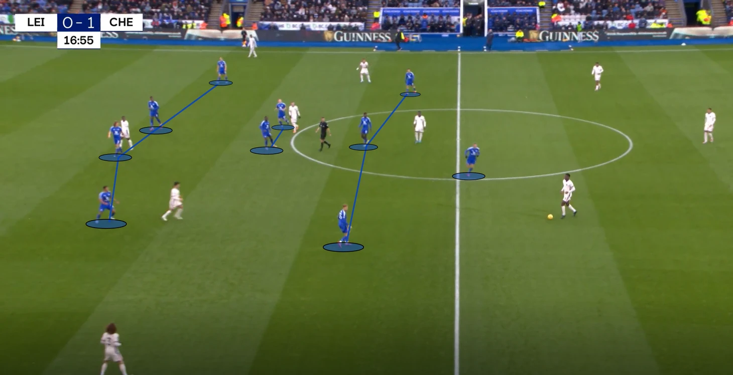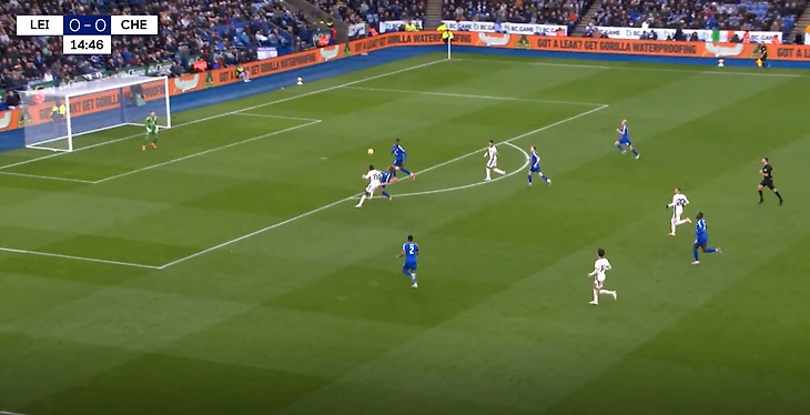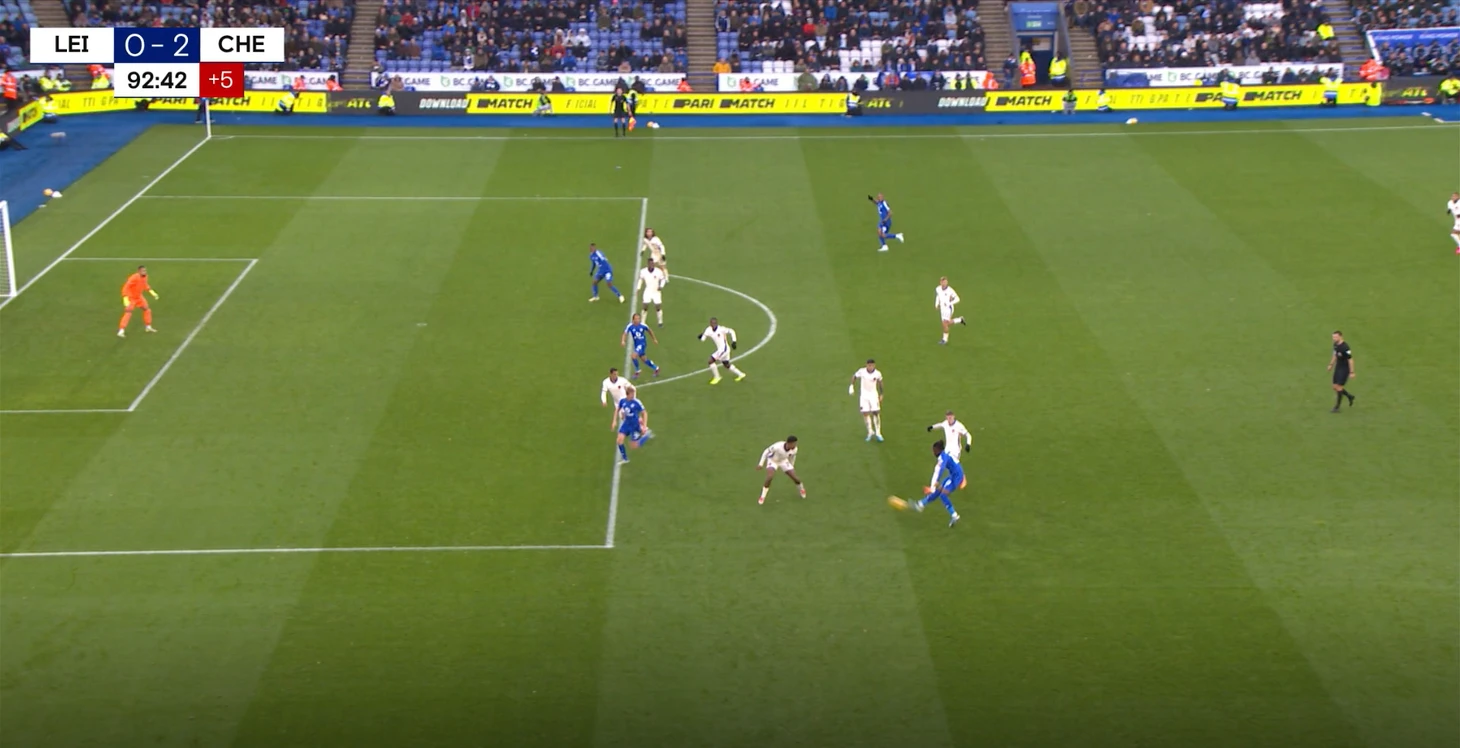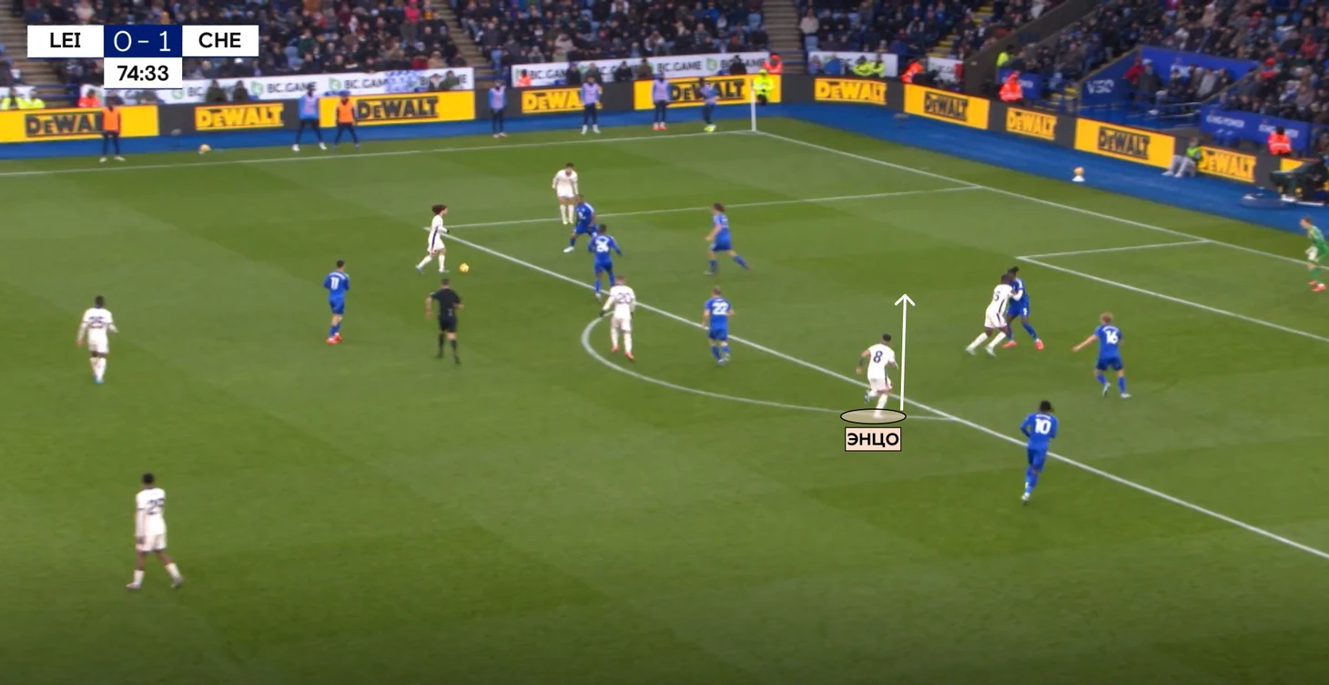 Новая роль Энцо следовала от соперника, ведь центр поля «Лестера» вряд ли можно назвать их сильной стороной. По ходу встречи было заметно, что во многих моментах могло хватить одного Кайседо, плюс к нему в зону поднимался Фофана (особенно это заметно во время прессинга у ворот «Лестера», когда Энцо находился чуть ли не в одной линии с Джексоном).