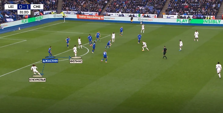 Взаимодействие Феликса и Кукурельи ярко показано в моменте с не засчитанным голом Мадуэке. Жоао отвлек на себя Джастина, и для Марка открылся свободный коридор, куда испанец и побежал (увы, в офсайд).
