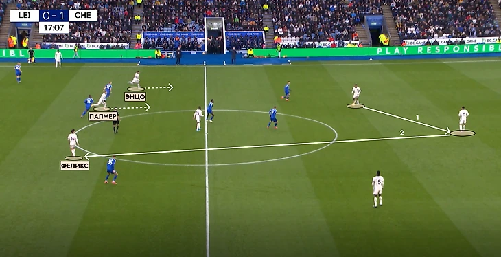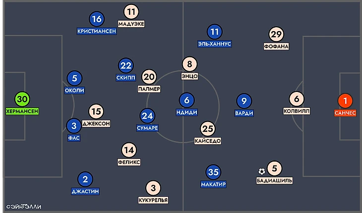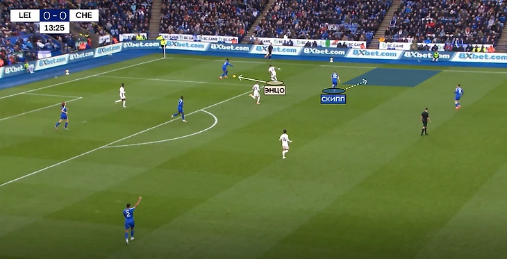 Чтобы оказать большее давление на оборону хозяев, к прессингу в первой линии поднялся Энцо, таким образом, «Лестер» терял преимущество двух защитников при розыгрыше от своих ворот.