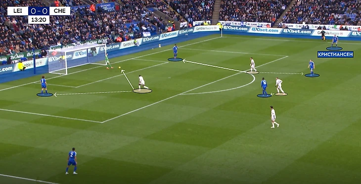 Скорее всего, «лисы» куда удачнее выходили из-под прессинга, используя фланги, ведь в довольно широкой позиции находились фулбеки. Но как раз одного из них и не хватило для удачного розыгрыша. В моменте приема мяча Околи, Кристиансен решил убежать вперед (видимо, с целью быстрой атаки) попутно оставив свой фланг пустым, куда не успел сместится Скипп. В результате, Энцо запрессинговал Околи, и «Челси» заработал угловой.