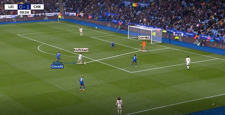 В концовке первого тайма, «Лестер» попробовал запрессинговать у чужой штрафной и чуть не получил из этого выгоду. «Лисы» оказали давление на Санчеса, и Роб отдал рискованный пас на Кайседо, которого уже накрывал Сумаре. Благо, момент не закончился голом.