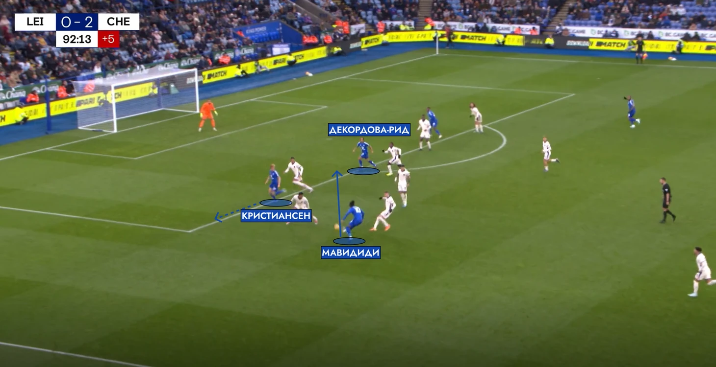 Для начала стоит отметить командную игру «Лестера». Кристансен увел Колвилла, тем самым создав коридор для рывка в обороне «Челси». И в этот же коридор Мавидиди отправляет мяч на Декордова-Рида. Спустя пару мгновений полузащитнику в штрафной на ногу наступит Лавия, который не успел за рывком ямайца.
