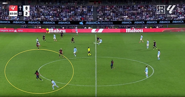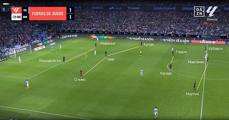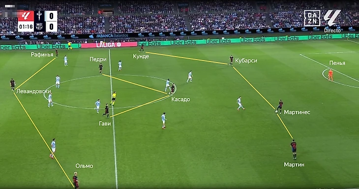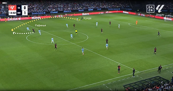 Против «Сельты» Рафинья всё-таки появился правее. Бразилец комбинировал более широкое расположение со смещениями в полуфланг. Фактически изначальное расположение каталонцев можно было записать как 4-3-3 с Касадо в роли глубинного опорного полузащитника.