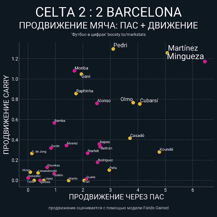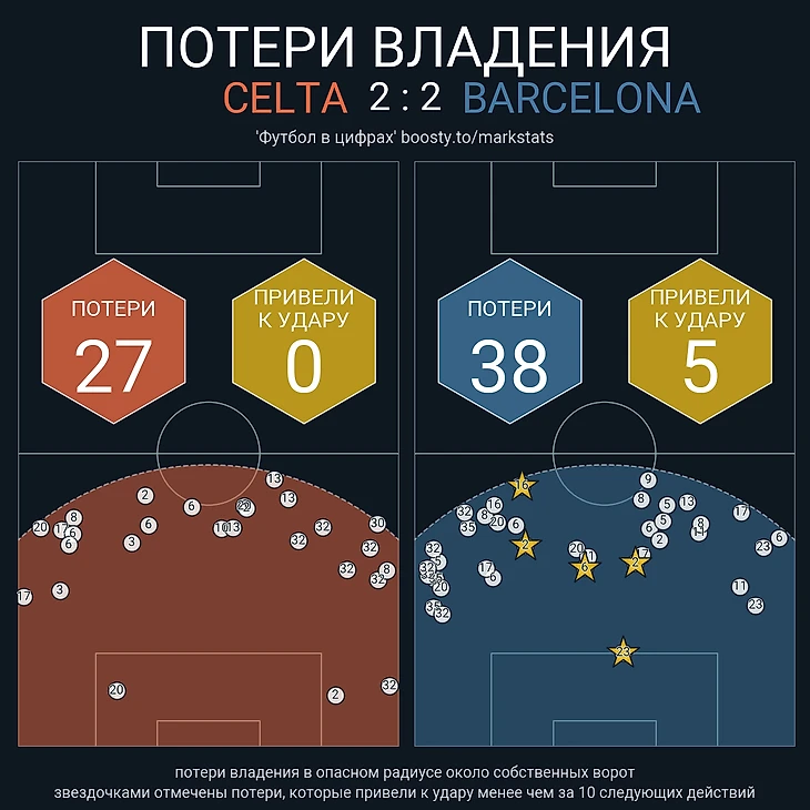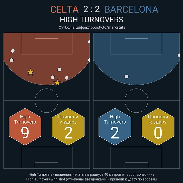 Периодически «Сельта», как и «Барселона», включала высокий прессинг и стремилась оказывать давление на соперника на чужой половине поля. Команда Хиральдеса приблизилась к интенсивности прессинга каталонцев (PPDA: 10.2 против 9.3).
