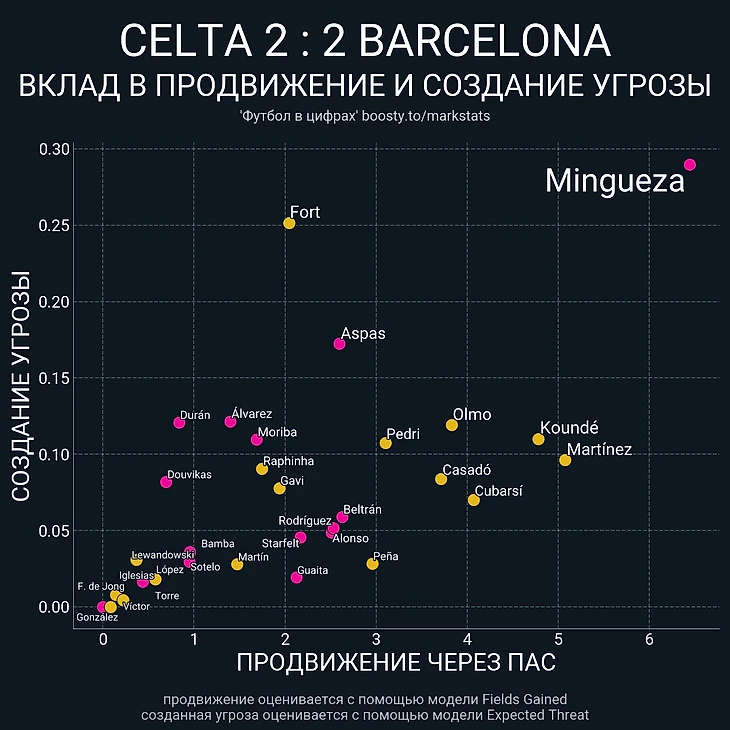 У чужих ворот Оскар также принёс много пользы: стал лучшим в матче по очкам ожидаемой угрозы с игры (0.29) и продвигающим передачам (11). На графиках хорошо виден вклад Мингесы в создание и продвижение: игрок находится в правом верхнем углу, что свидетельствует о высоком уровне действий в конкретном компоненте.