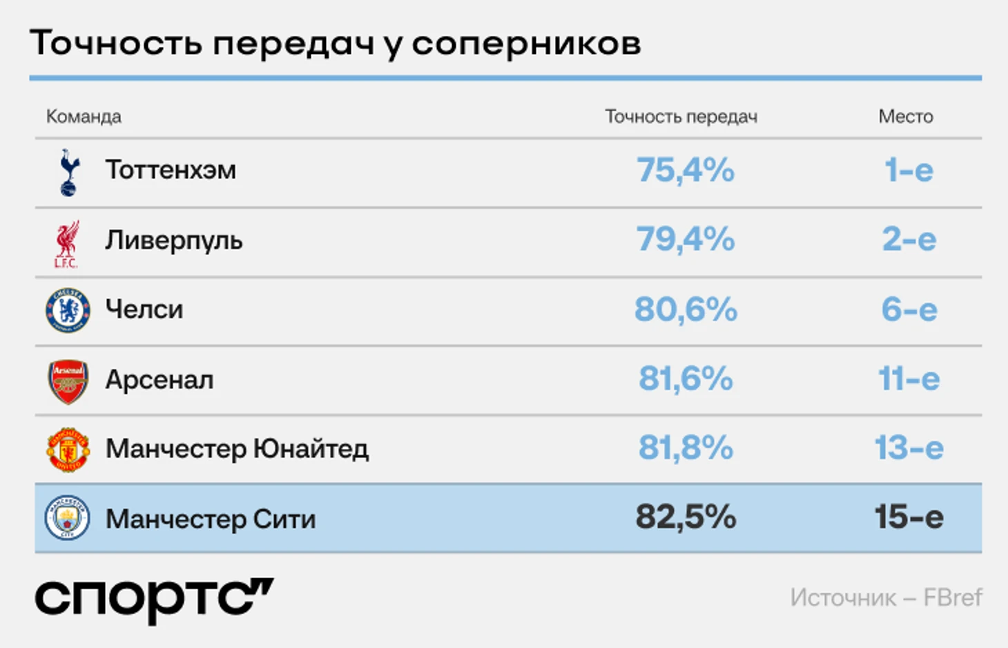 Точность передач у соперников – хороший индикатор того, насколько пассивной командой стал «Сити». По этому параметру они на 15-м месте в лиге и уступают всем в классической топ-6: