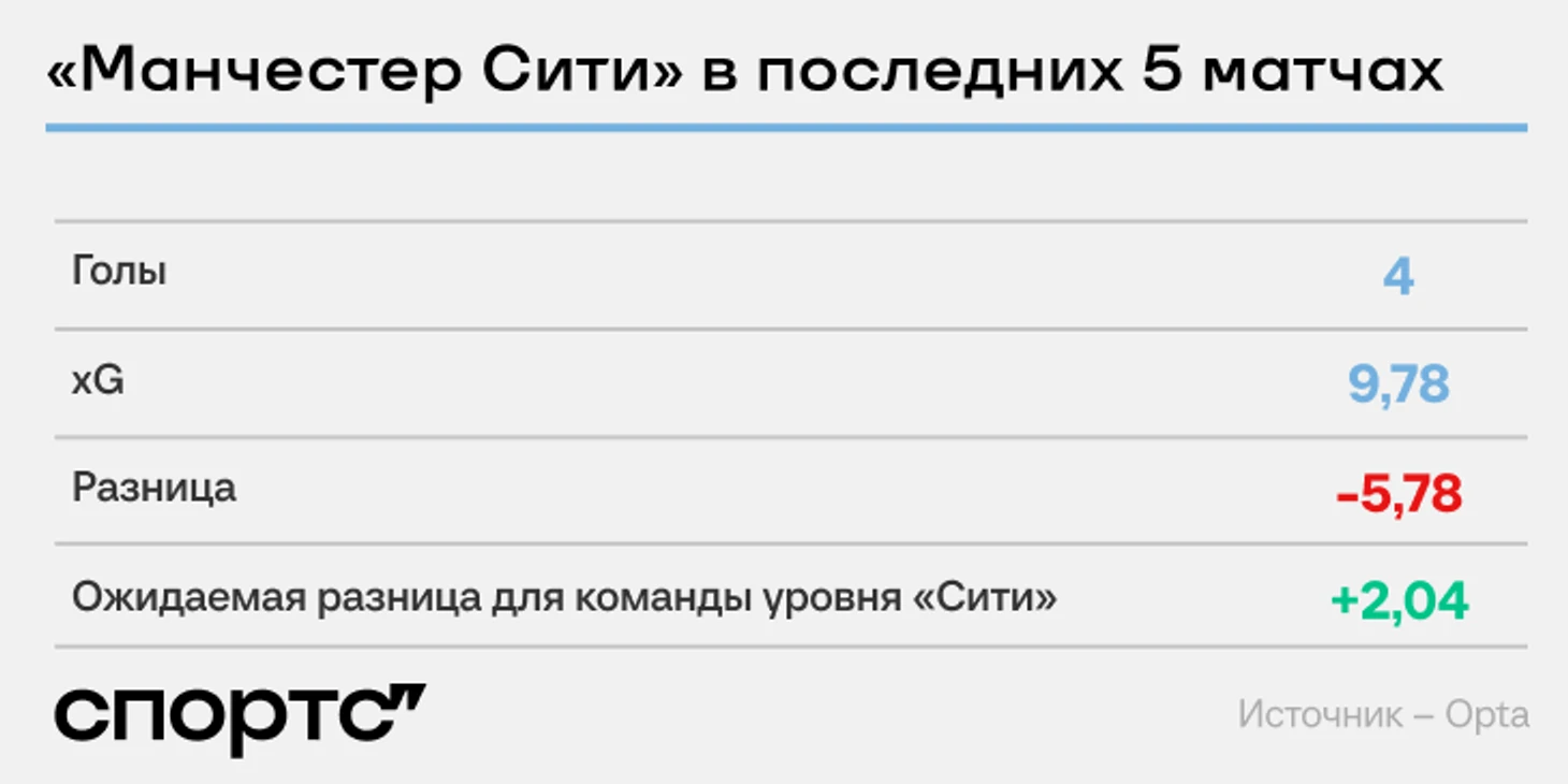 Теперь подробнее. Почему проблемы в атаке кажутся раздутыми? В пяти матчах команда Гвардиолы забила четыре мяча, создав 9,78 xG. При нормальной реализации можно ожидать 9-10 голов из таких моментов.
