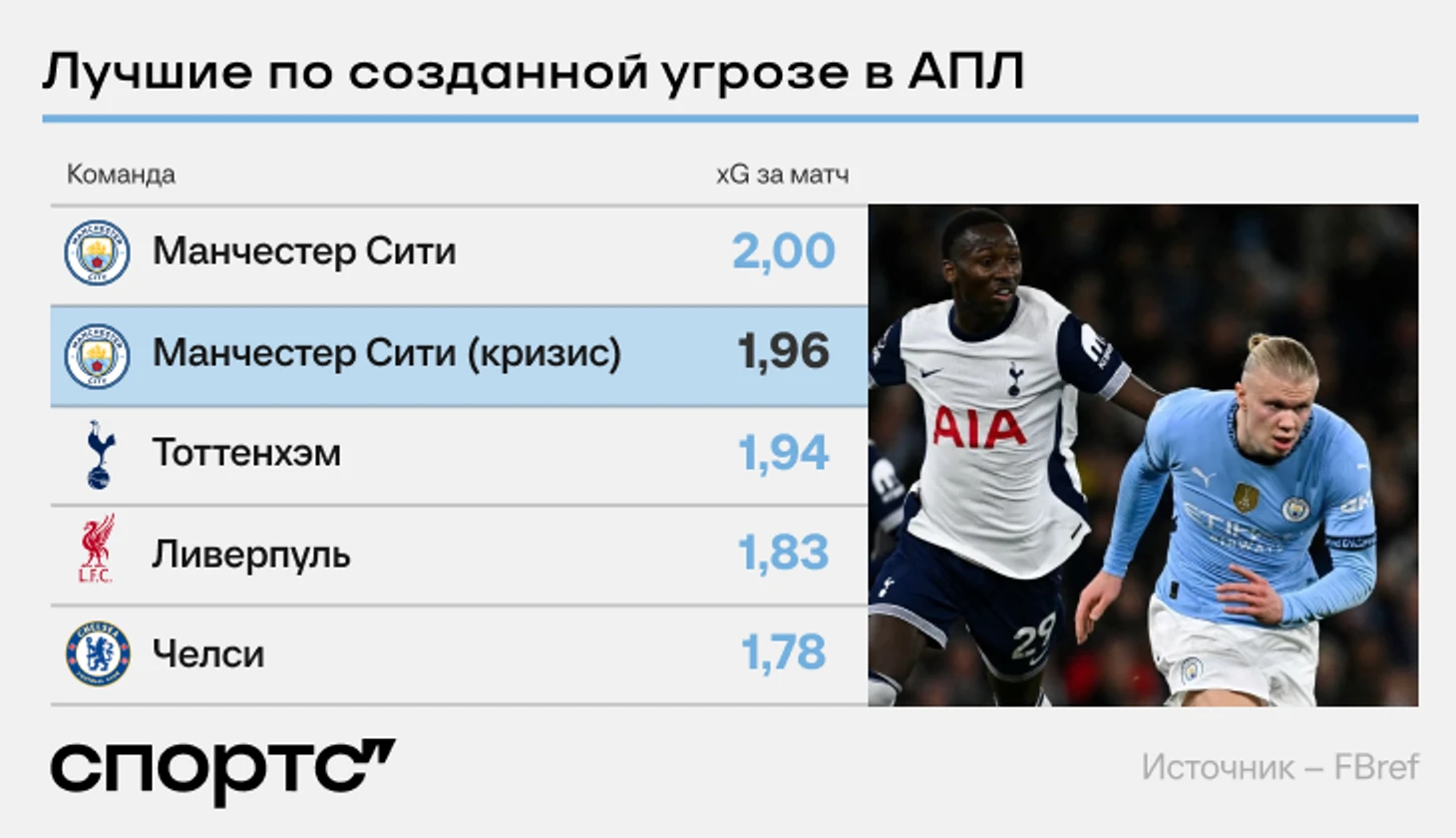 Для контекста: за пять кризисных матчей «Сити» создавал 1,96 xG за игру. Вот так этот показатель смотрится на фоне АПЛ: