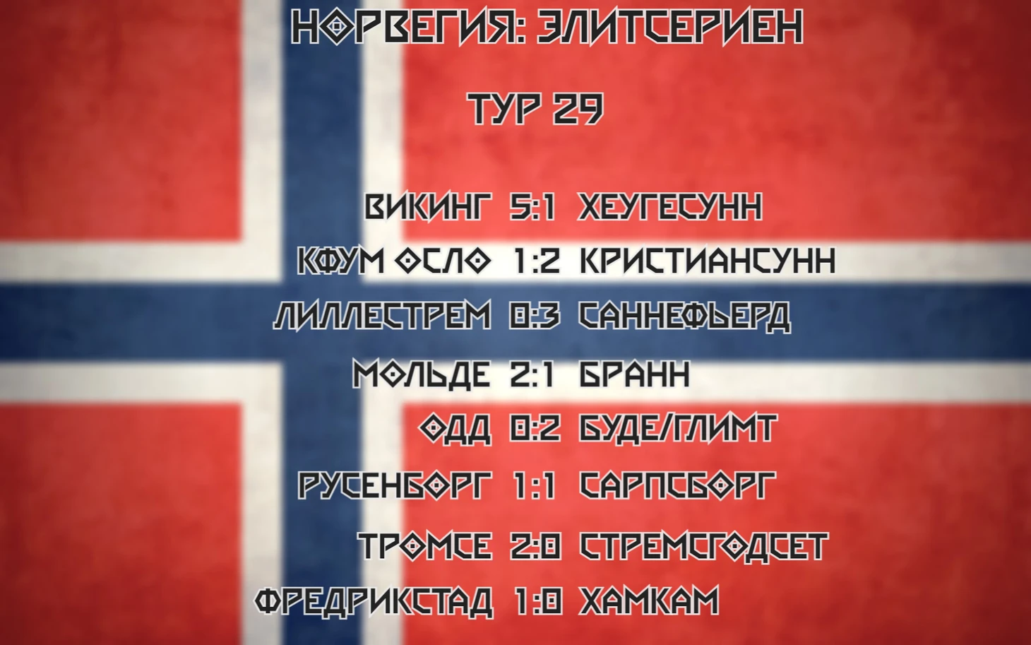 ● «Мольде», несмотря на потери, сумел обыграть «Бранн». Дубль оформил Ула Брундхильдсен. «Бранн» упускает первую строчку, и теперь остается надеяться на осечку «Буде/Глимт» и обыгрывать «Викинг».