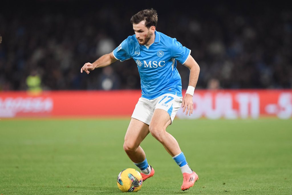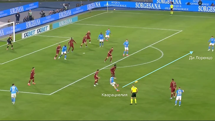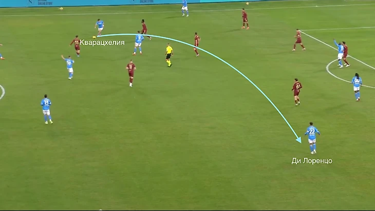 Хвича с мячом убирает мяч под правую и делает перевод на Ди Лоренцо, который находится в привычной для себя, как для крайнего защитника, высокой позиции в полуфланге.
