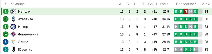 К 13 туру в итальянском чемпионате наблюдается высокая плотность в первой шестерке по количеству набранных очков. Сразу четыре клуба – «Аталанта», «Интер», «Фиорентина» и «Лацио» – делят второе место. За ними следует «Ювентус», отставая всего на три очка.