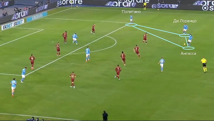 На правом фланге активно взаимодействовала тройка Ди Лоренцо – Ангисса – Политано. Комбинируя между собой, игроки стремились к выводу одного из них на позицию, с которой можно было доставлять мяч в штрафную площадь.