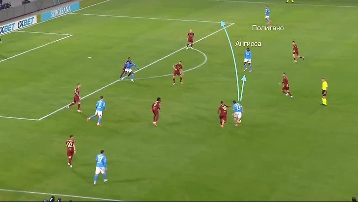 Но, тем не менее, своевременный перевод мяча от Хвичи + позиция Ди Лоренцо и создание перегруза против Анхелиньо 2v1 вместе с Политано + позиция Ангисса, который связал левого ЦЗ, что открыло коридор в полуфланге для Ди Лоренцо (треугольник сработал и в таком ключе) – все это позволило забить победный гол «Наполи» в этом матче.