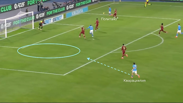 Еще один пример с участием Политано и Кварацхелии. После смещения в центр под удар, на дальней штанге открывается Хвича под возможный «мягкий» заброс на него. Но Маттео принял решение ударить по воротам.