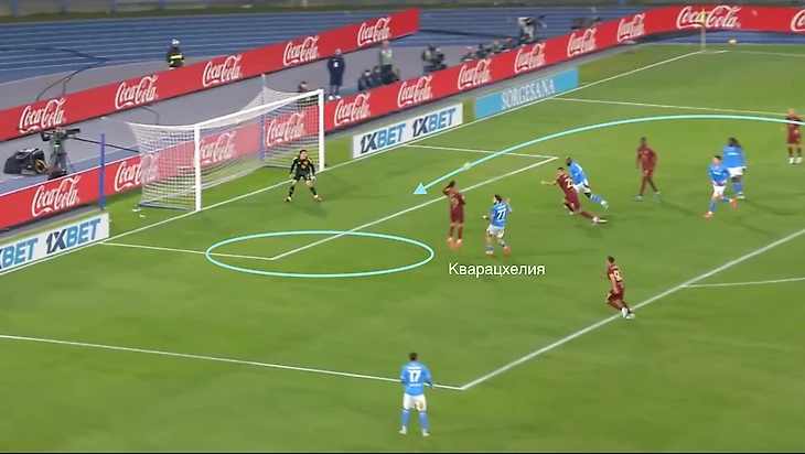 Зона для доставки мяча была выбрана в пользу дальней штанги, куда должен был вбегать Кварацхелия.