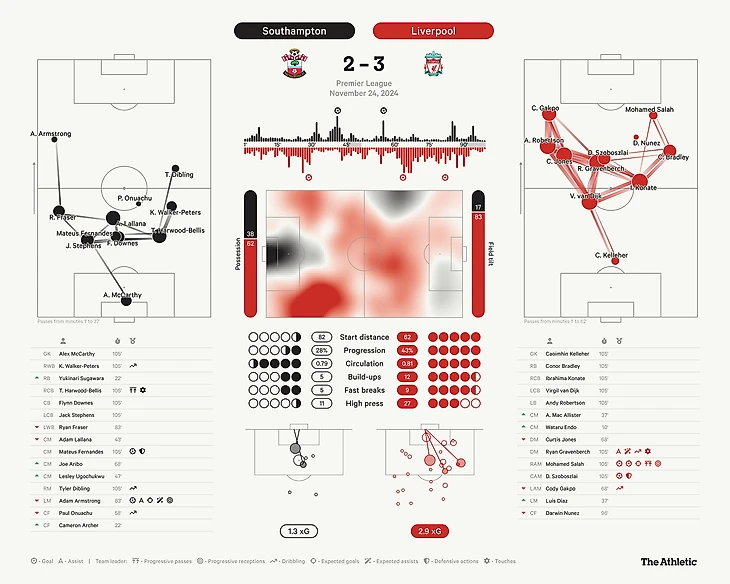 Оборона во главе с центральными защитниками Вирджилом ван Дейком и Ибрагимой Конате излучали спокойствие в первой части сезона, пропустив всего шесть мячей в первых 11 матчах. И все же вчера они не были такой уверенной и стабильной силой в игре против «Саутгемптона», который забил всего семь мячей за столько же матчей.