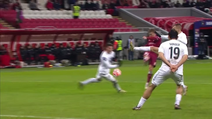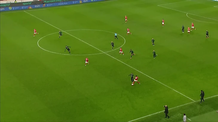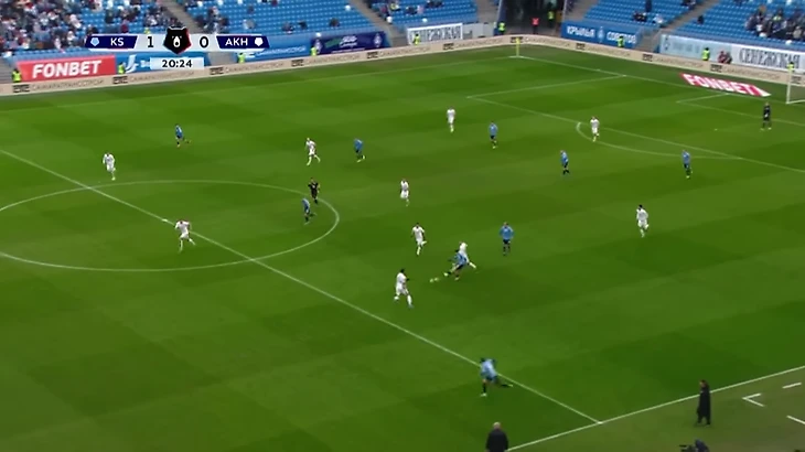 Ракурс камеры - такой же, что и на скрине выше и совсем не подходит для определения офф-сайда, поэтому что-то определенное сказать нельзя. Но сравнение позы игроков и расстояния до центральной линии позволяет усомниться в правильности решения. Потом был в игре отличный сольный проход Самородова на 42 мин., приведший к созданию сразу 2 Вig Chance с общим xG 0,93 и голу с добивания. Больше моментов Ахмат за игру не создал, а вот Шадыханов - создал пенальти в пользу грозненцев после такого виртуального контакта на 60 минуте