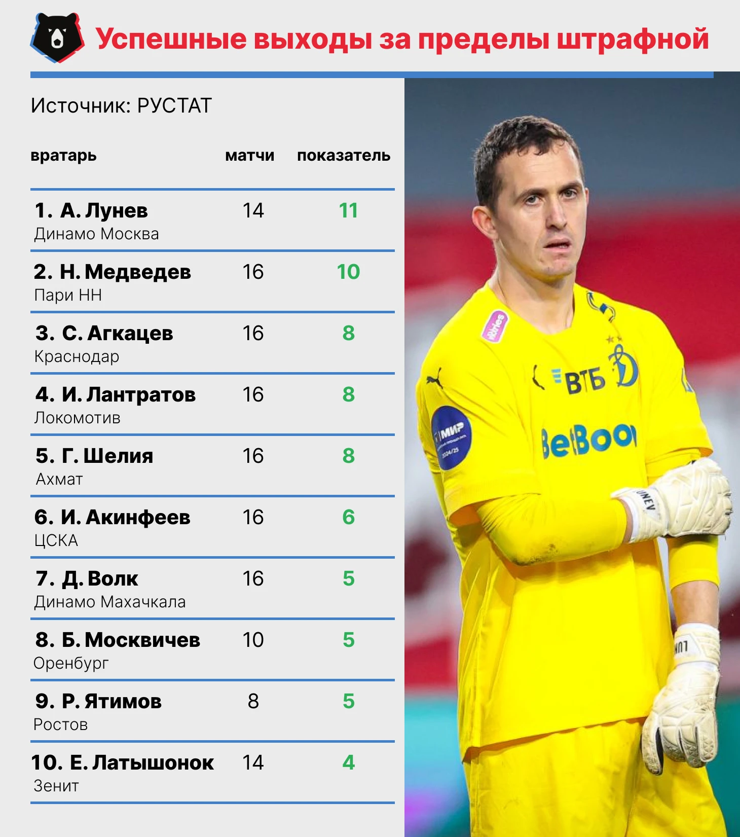 Опытный Никита Медведев (ему уже 29 лет, вот сюрприз!) на второй строчке данного топа. Неважно, кто тренирует нижегородцев – Саша Илич или Виктор Ганчаренко – Никита успешно страхует свою линию обороны за пределами штрафной. Вдобавок к этому у него 5 «сухарей» (пятый результат в лиге) и 1 отраженный пенальти из 3 назначенных в ворота «Пари НН».