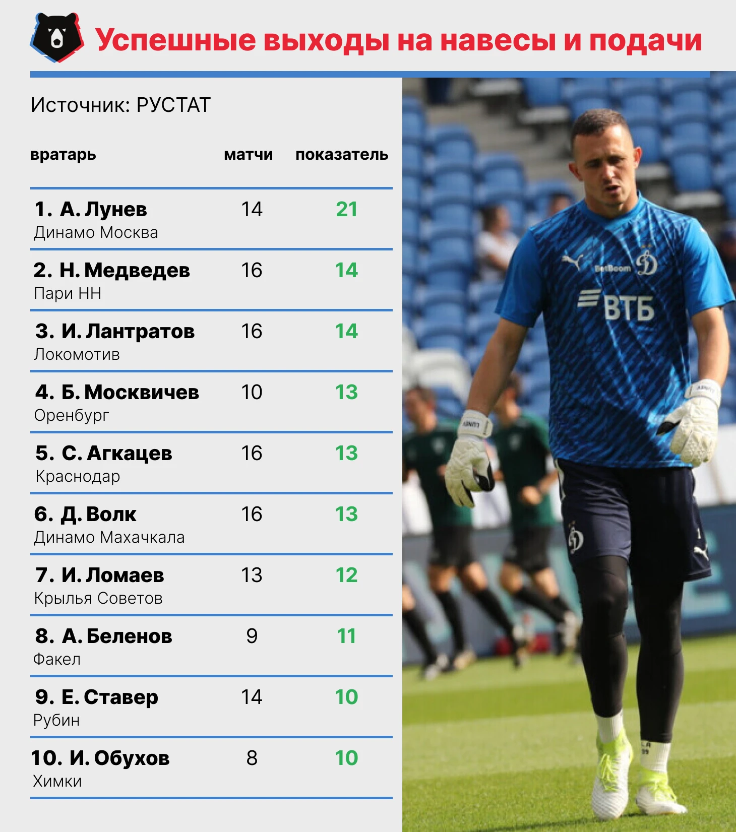 Безоговорочно крут по этому показателю Андрей Лунев – аж 21(!) успешный выход на подачи и навесы. Вот что значит успешный опыт за границей (все, больше шуток на эту тему не будет). И это еще один весомый аргумент в пользу того, зачем москвичам понадобился бывший голкипер «Зенита».
