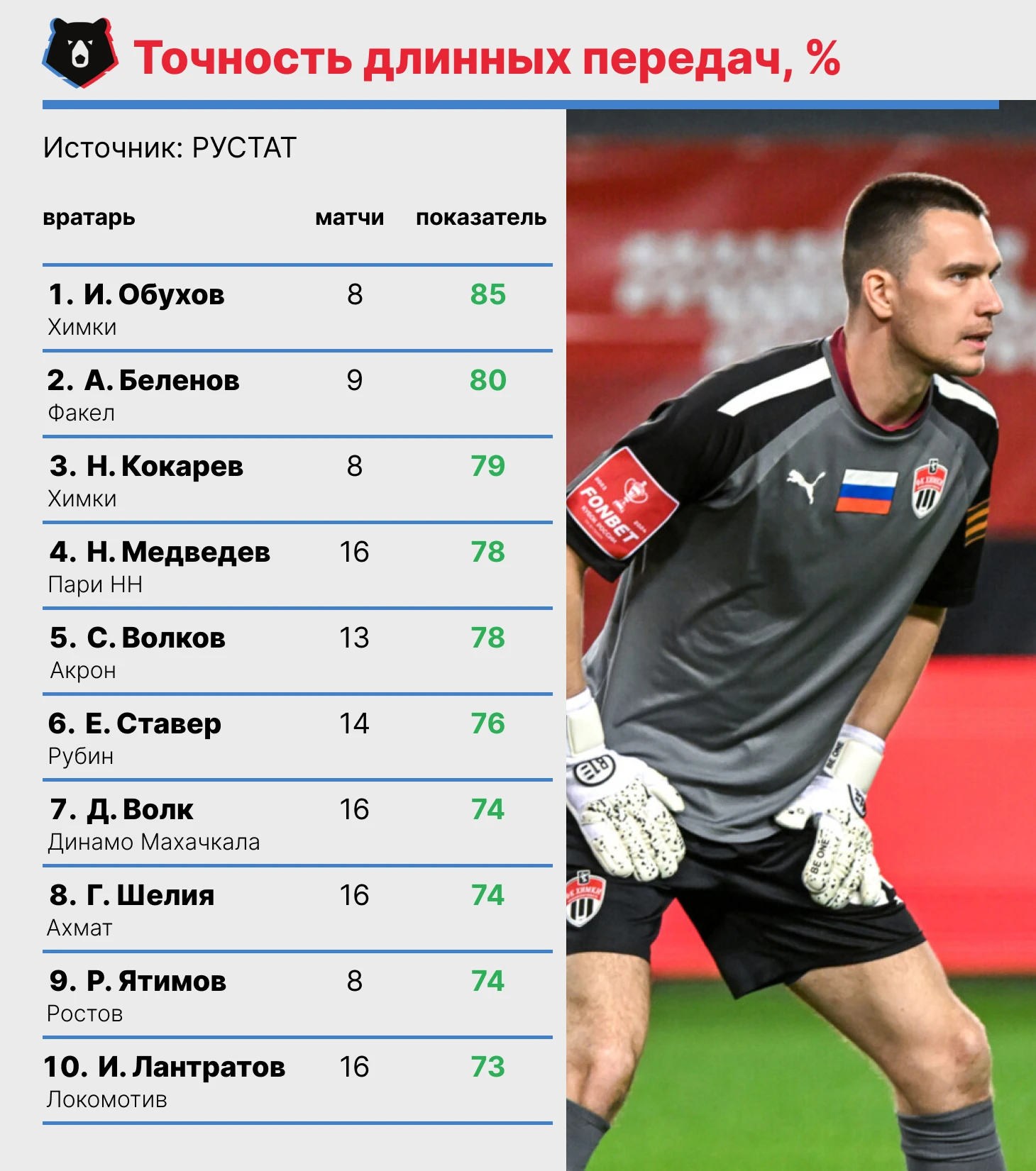Топ имени «Химок» – сразу два вратаря подмосковной команды занимают в нем лидирующие позиции. Сыгравшие по 8 матчей Игорь Обухов и Никита Кокарев неслучайно занимают 1 и 3 места соответственно. Стиль игры химчан при Франке Артиге строится на длинных передачах в сторону габаритного Антона Заболотного и реактивных Резиуана Мирзова/Александра Руденко. Обухов пасовал чуть точнее своего одноклубника, но в последних матчах РПЛ испанский тренер доверял место в воротах Кокареву. К тому же Игорь умудрился схватить удаление в недавнем матче ФОНБЕТ Кубка России против «Урала», в котором «Химки» с Хетагом Хосоновым в воротах эпично уступили екатеринбуржцам.