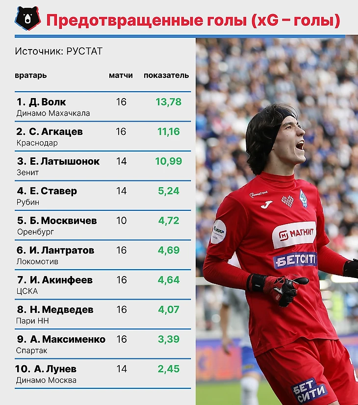 Давид Волк – абсолютно лучший по предотвращенным голам среди своих коллег по цеху. Данные говорят, что Давид предотвратил 13 голов соперников в свои ворота. Без подвигов Волка Махачкала явно плелась бы в хвосте турнирной таблицы, рискуя стать еще одной командой-лифтом. В случае дагестанской команды крылатое выражение «вратарь – половина команды» более чем уместно, пожелаем дебютантам РПЛ удачи и надеемся в следующем сезоне наблюдать перфомансы Давида и махачкалинцев в Премьер лиге.
